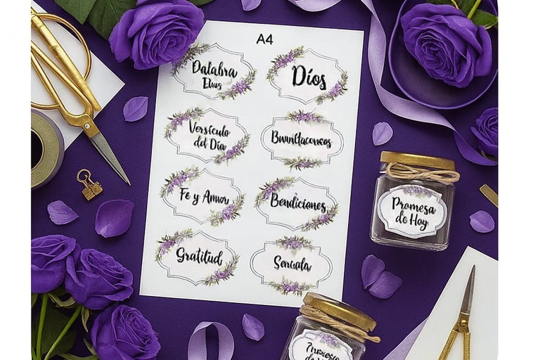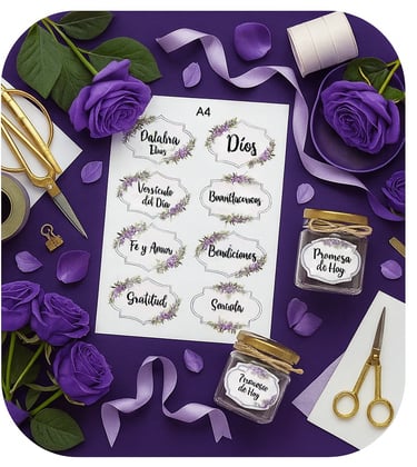 Pequeñas etiquetas hermosas con mensajes como “Palabra de Dios”, “Promesa del Día”, “Bendiciones” y más.